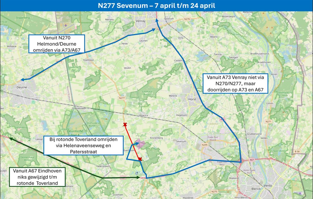 During Horse Driving Kronenberg 2026, there will be roadwork (April 7–24) on the N277 in Sevenum. Please be aware of detours: